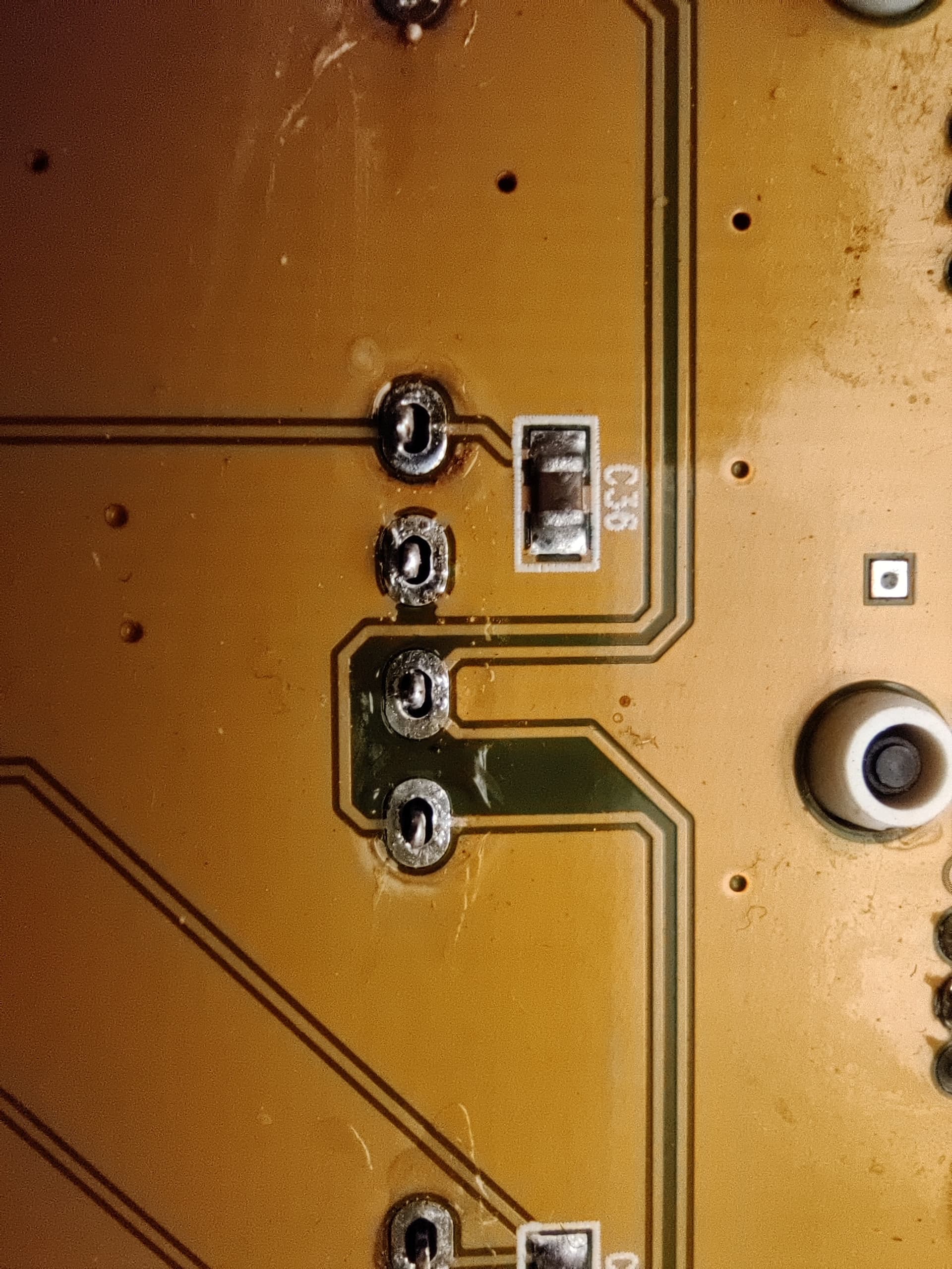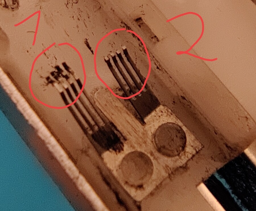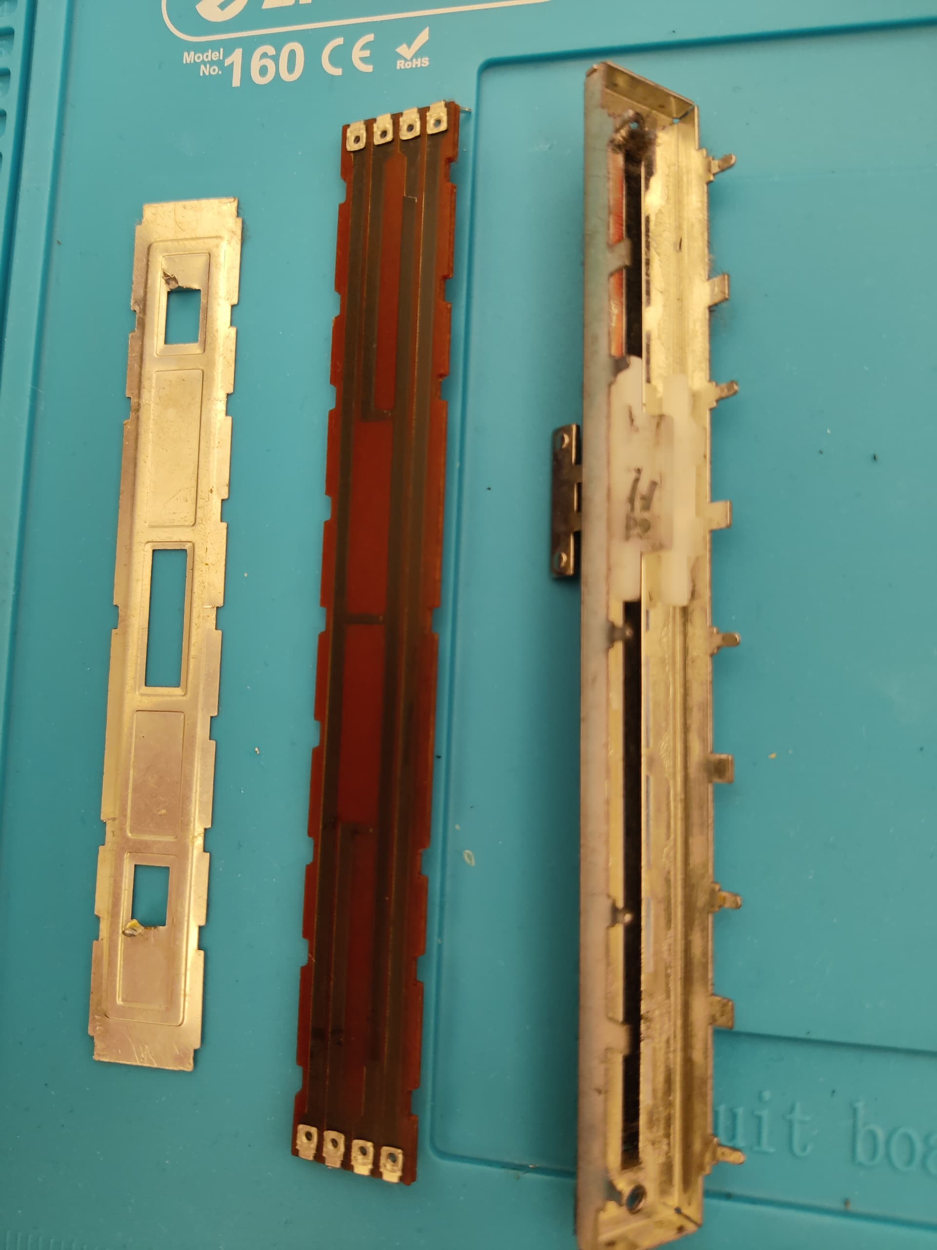 The first fader dismantled. The wipers only touch the two right sliding tracks: